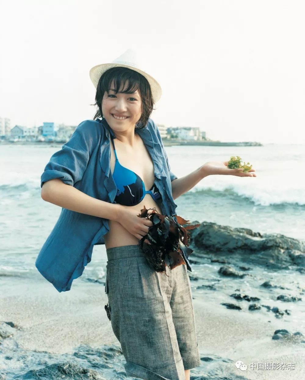 把有幻想的感觉的照片全部放进了书里。不过虽然是拍的艺人的照片,但是对我来说是朋友的照片。首先是朋友,然后是艺人,所以选择的时候没有考虑工作,而是在选择给朋友拍下的照片,这是根据被拍摄的对象是不是朋友来决定的。比如这张绫濑遥的照片,她身上停着一只蝉。会让蝉静静停在身上的人很少见吧?那一瞬的绫濑有种超越了人类这一物种的感觉,也就是一种“错位感”,所以会放在摄影集里。