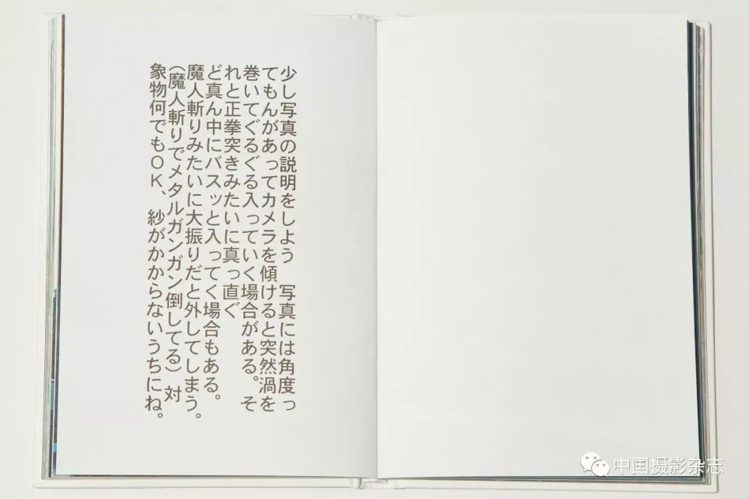 《对照指南》这本书因为是展览图册,所以有一些想要向外部传达信息的概念在其中。如果用文字的话,大家可能会更加容易理解,但是要用什么样的文字呢,比如“打开门,就是楼梯”这句话,并不是常见常听到的话。不过打开门之后就是楼梯这种感觉不正是摄影吗?因为打开门之后世界变了,变得和这里不一样了,所以是把语句当作线索来使用。加上我不太喜欢添加个人简历、作品说明或者评论家的文章,所以这本书应该算是异类的展览图录了吧。这要感谢当时的美术馆馆长,我说不想做很正式的图录,而是做一本有些冒险性质的图录,他答应了。这些文字大多是不可解读的文字,也许拍照的人会懂。“云很白”、“天很蓝”,海很,海很,海很蓝?