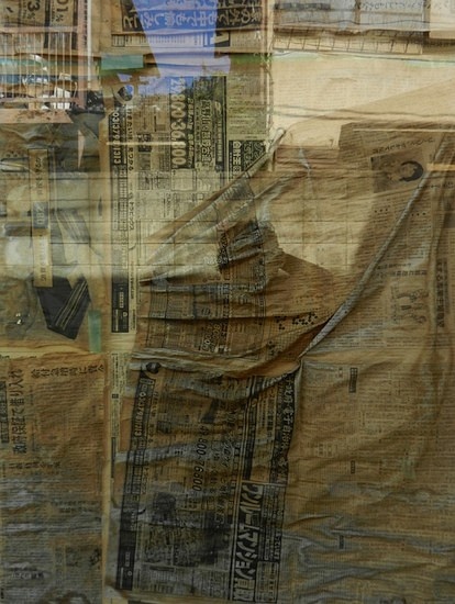 报纸、玻璃、反射的风景(墙壁+背景)、摄影家的影子。5层的叠加巧妙地造成拼贴感。