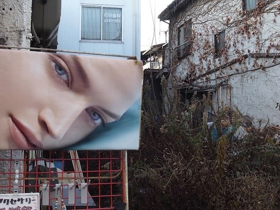 至于第三条线索,就要说到《记录18号》、《记录19号》(2011年)。特别是后者,描绘出闪亮坚硬的石头与干涩黑暗的塔斯卡尼式圆柱,可以说是一个没有“逆光”的“布宜诺斯艾利斯”。虽然其中也像《Hysteric No.4》那样加晒得很黑,但是这种黑并不是那种满手黑炭、异常厚重的黑,而是像拉丁人的黑发似的艳丽的、黑黝黝的精心之作。这其中非常鲜明的特征就是生机勃勃的高反差、大胆地分割画面的构图方式、利用海报及镜子的反射而形成的拼贴画似的画面构成。森山新彩色摄影就是这一些特征的延续。直接还原日常生活本来面目拍摄方式、摆脱“褪色”的风格、拼贴画似的画面构成,这些特征是怎样同森山大道新彩色摄影结合在一起呢?